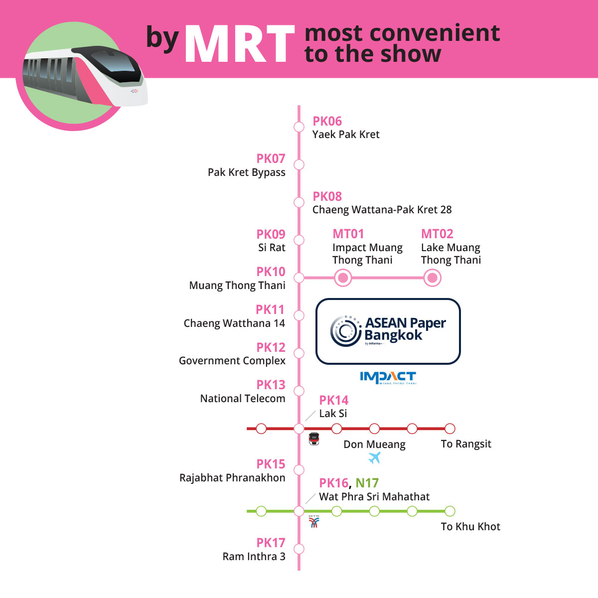 More convenient than ever! Travel to IMPACT Muang Thong Thani via the Pink Line Monorail. Transfer at Muang Thong Thani Station (PK10) to connect to the Pink Line Extension.